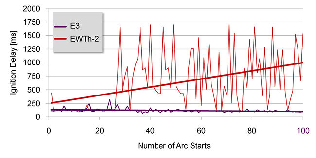 over time while thoriated tungsten starts to deteriorate after only 25 starts.