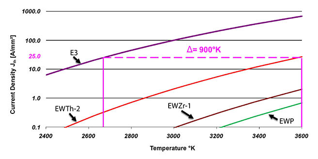 E3® electrodes are shown to run approximately 1650° F cooler than thoriated tungsten at the same energy output.